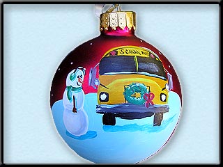 snowman or lady standing along side a school bus decorated with a