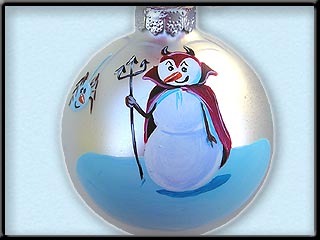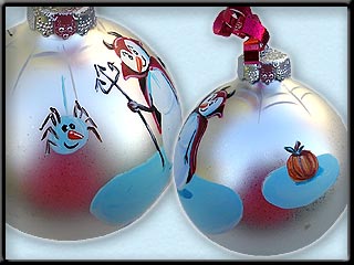 This design features a snowman (or Lady - girls get eyelashes) dressed as a devil - horns and all.  On the left side of the design is a snowball spider hanging from the spider web around the top of the bulb.  On the right side of the design is a pumpkin.