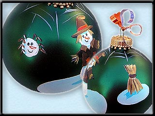 On the left side of the design is a snowball spider hanging from the spider web around the top of the bulb.  On the right side of the design is a straw stack