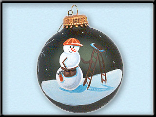 snowman wearing a hardhat and tool belt standing next to a ladder.