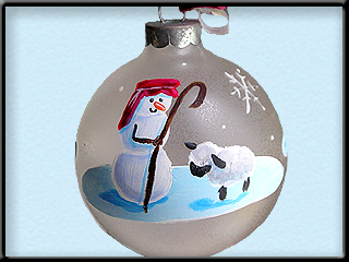 This design features a snowman dressed as a Shepard tending his sheep or lamb.