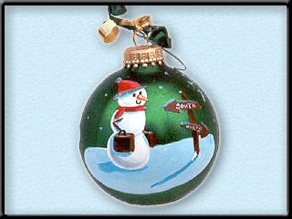 snowman or snowlady heading 'north' with bags in hand.